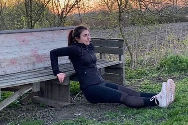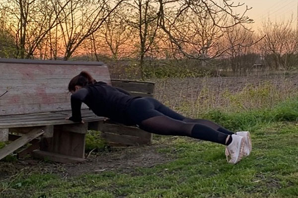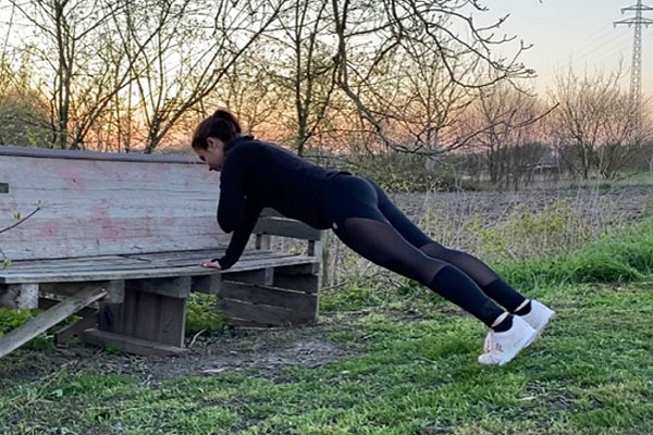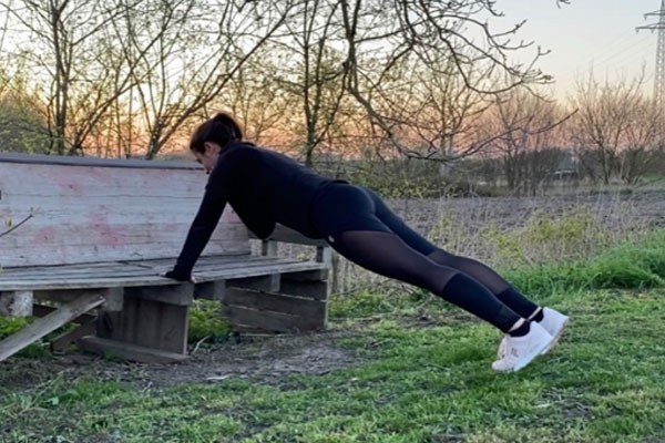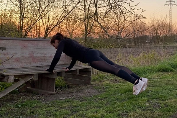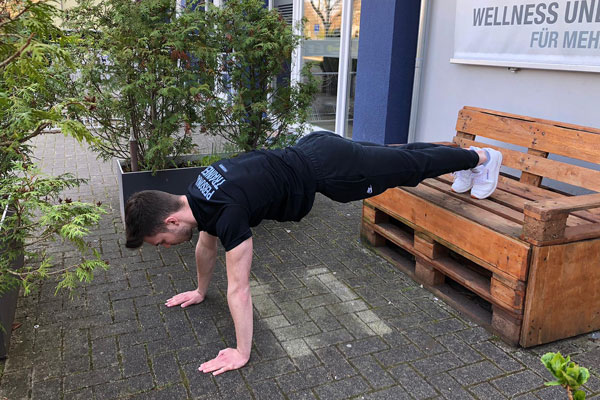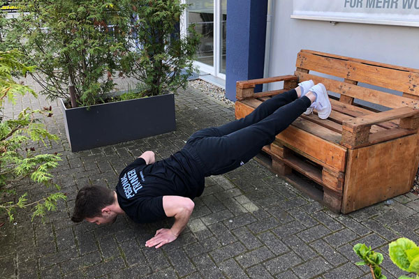Bei dieser Übung stützt du deine Arme schulterbreit auf der Bank und deine Füße stehen hüftbreit auf dem Boden.