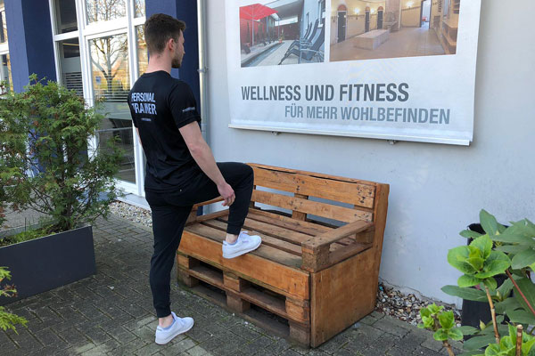 In der Ausgangsposition dieser Übung stellst du ein Bein auf die Bank, das andere bleibt auf dem Boden. Nun drückst du dich, mit dem auf der Parkbank platzierten Bein, nach oben, als würdest du eine große Stufe hinaufsteigen.