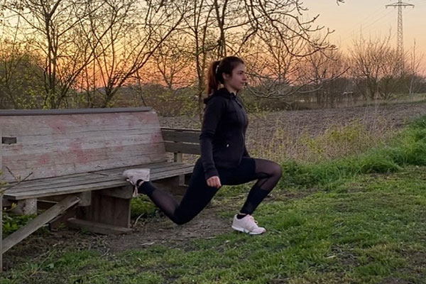 Den hinteren Fuß legst du auf der Bank ab und der vordere Fuß ist ungefähr einen Meter von der Bank entfernt, sodass du einen Ausfallschritt machst.