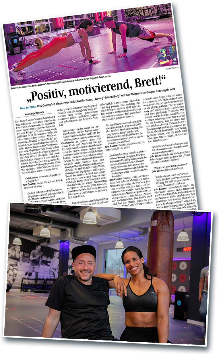Der Gute-Laune-Macher hat wieder zugeschlagen: Entertainer und Sänger Cris Cosmo hat nach 2020 mit dem Fitnessunternehmen Pfitzenmeier den zweiten Motivationssong "Beweg’ deinen Body" geschrieben, produziert und veröffentlicht. Die motivierenden Textpassagen und rhythmischen Beats laden dazu ein, dass der Bewegungsimpuls auf den Hörer übergeht und man einfach nur mittanzen und sich bewegen möchte.