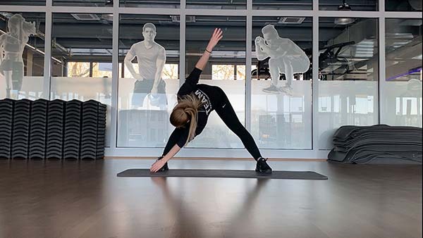 Mache einen seitlichen Ausfallschritt, sodass deine Beine etwas breiter auseinander auf dem Boden stehen. Versuche nun abwechselnd mit der rechten Hand deinen linken Fuß und mit der linken Hand deinen rechten Fuß zu berühren.