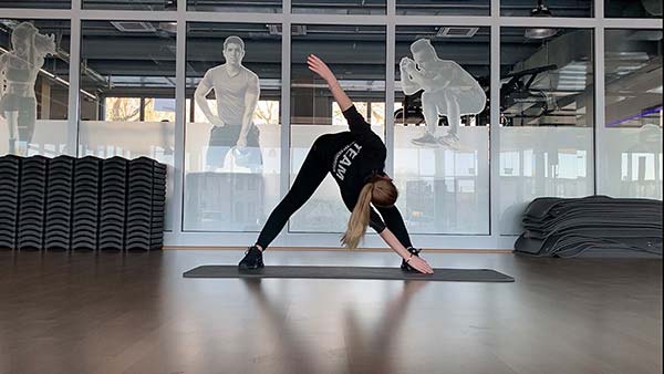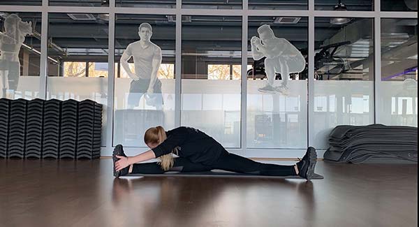 Setze dich auf eine Matte und versuche, die Beine so weit wie möglich auseinander zu spreizen. Genau wie bei der vorherigen Übung wird einmal die rechte Hand zu deinem linken Fuß und danach die linke Hand zu deinem rechten Fuß geführt.
