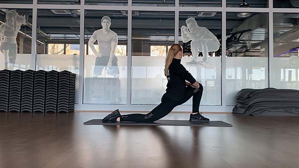 Für die nächste Übung machst du einen großen Ausfallschritt nach vorne. Versuche, deinen Körper immer weiter nach vorne zu lehnen, bis du ein Ziehen in den Beinen und im Beckenbereich spürst. Dehne so weit wie möglich nach vorne. Dein Schienbein berührt dabei den Boden. Die Hände kannst du auf deinem Knie abstützen.
