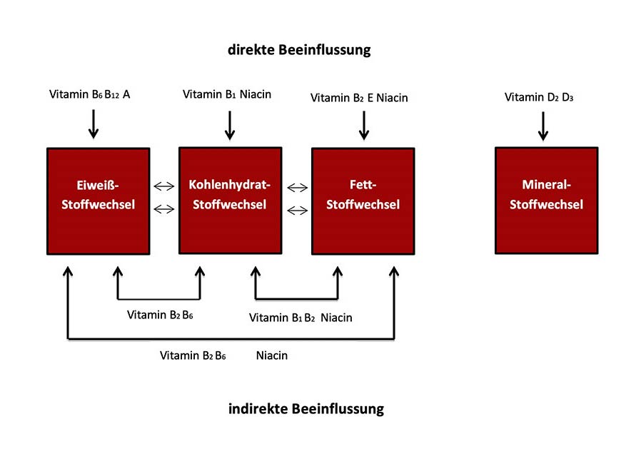 Unsere Vitamine, die wir zu uns nehmen, sind selbst keine Energie-Lieferanten, aber sie sind an allen Regulationen und Steuerungen aller Stoffwechselvorgänge beteiligt. Man unterscheidet sie an ihrem Lösungsverhalten und ihrer Beeinflussung auf die Stoffwechselvorgänge.